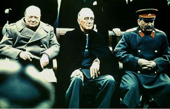 1945年2月雅尔塔会议期间,苏联领导人斯大林、美国总统罗斯福、英国首相丘吉尔合影