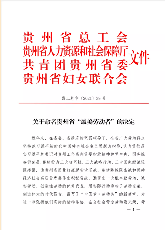 2021年,贵州省总工会、贵州省人力资源和社会保障厅、共青团贵州省委员会、贵州省妇女联合会联合在全省范围开展“最美劳动者”选树宣传活动,对积极投身三大攻坚战、三大战略行动、三大国家级试验区建设,为贵州高质量打赢脱贫攻坚战、疫情防控阻击战和保持经济社会高质量发展作出积极贡献,涌现出一大批辛勤劳动、诚实劳动、创造性劳动的优秀代表进行表彰。