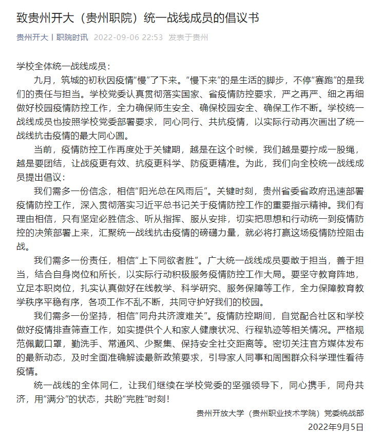 疫情发生以来,贵州开放大学(贵州职业技术学院)统一战线成员在学校党委的领导下,闻令而动、各司其职,发挥统战优势,凝聚智慧力量,展现担当作为,以实际行动画出了统一战线抗击疫情的最大同心圆。