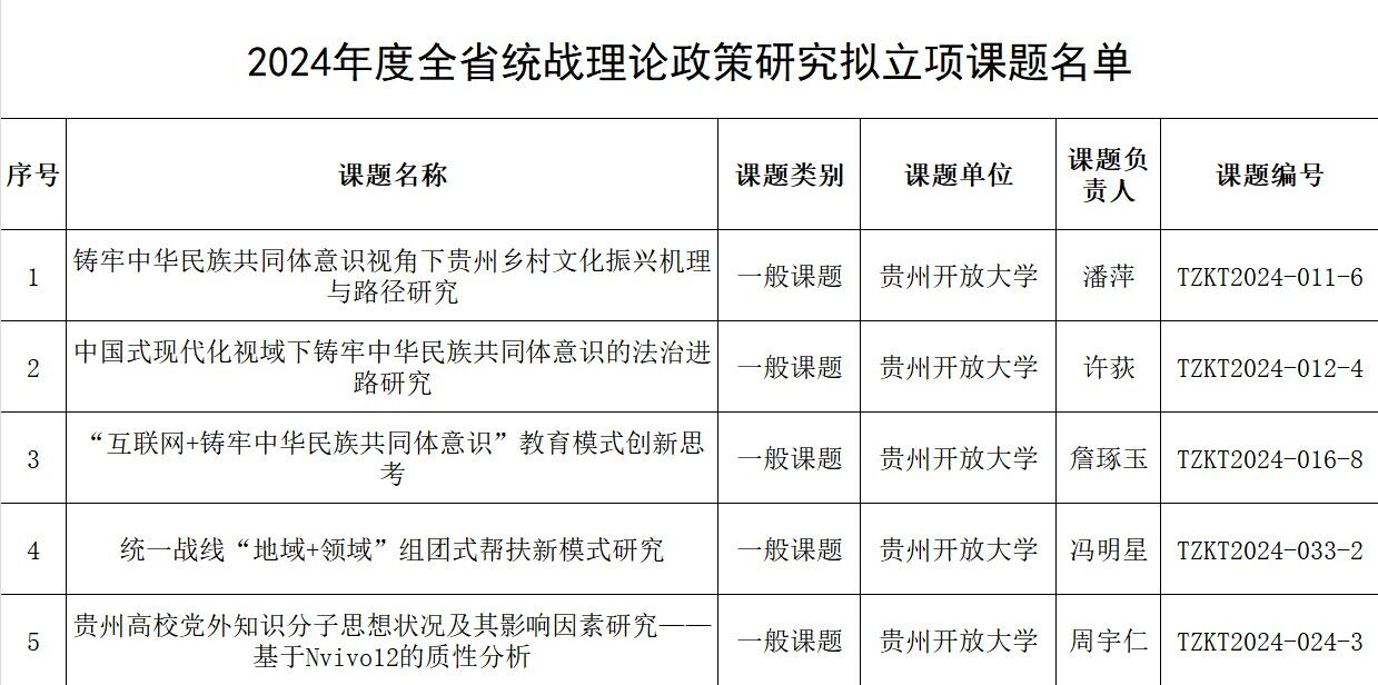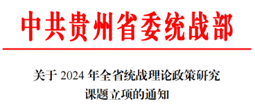 近日,中共贵州省委统战部发布了关于2024年度全省统战理论政策研究课题立项的通知,我校共有5个课题获准立项,这标志着我校统战科研申报在省级取得新突破,也呈现了学校党委着力推进统战理论研究的新成效。